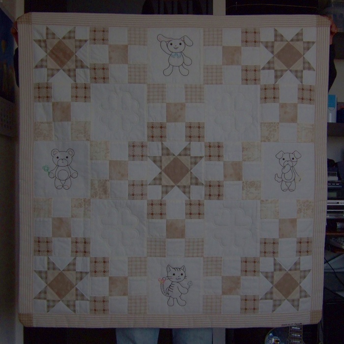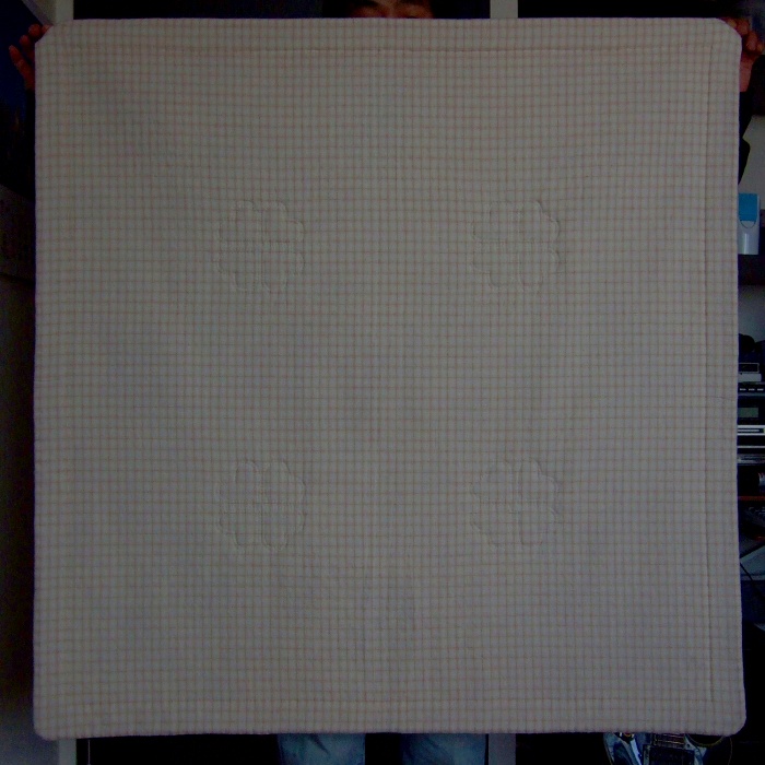 普通のキルトはもっと全面をきっちり裏布までキルティングするんだけど、そうしたらペッタンコになって柔らかさがなくなってしまうので、ベビーキルトの場合は仕上げのキルティングだけを裏布まで刺すようにしています。