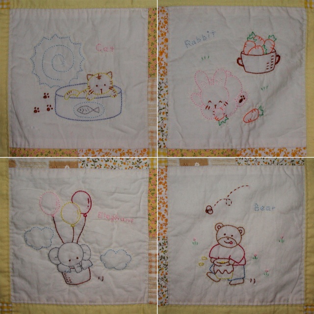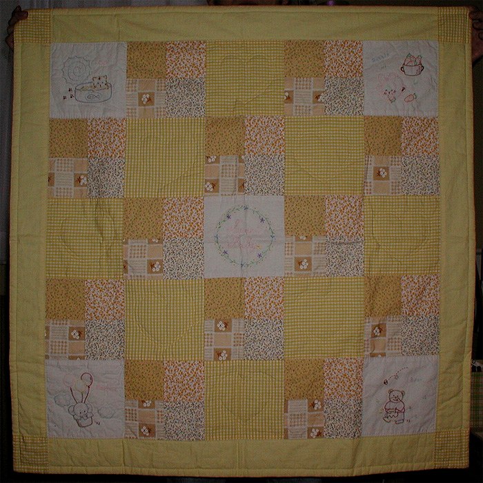 お友達の出産祝いにと作ったベビーキルトです。友達のリクエストで男のコでも女のコでもいけるようにと黄色を基調にしました。