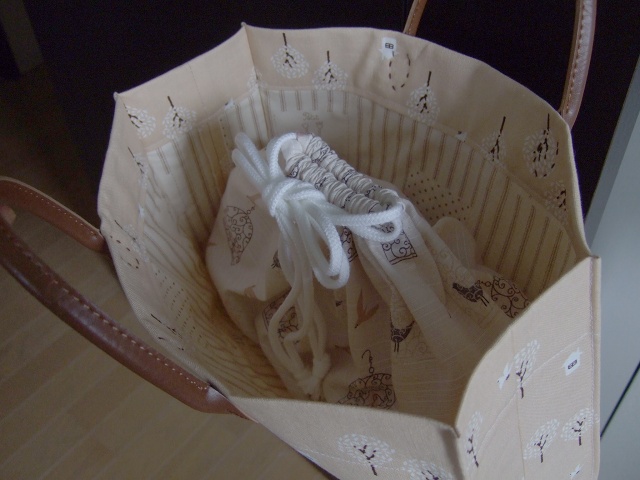 あまりにも中が丸見えなので、鳥カゴ柄の巾着を作りました