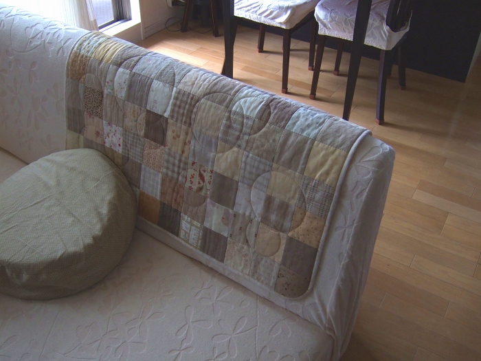 キルティングも布地に沿って四角くしてしまうと、普通っぽくて可愛くないので、大小の円をあちこちに配してみました。