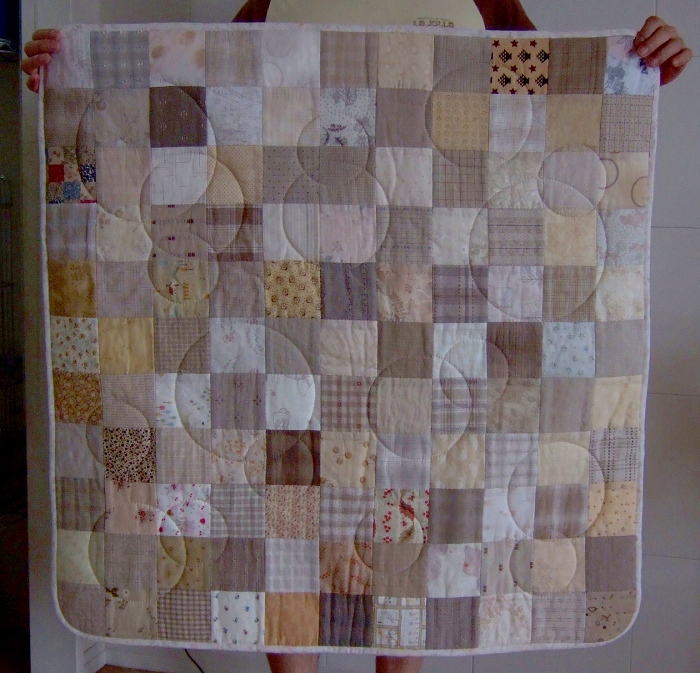 ずいぶん前に買っておいた100枚セットのハギレに、21枚追加して11×11の四角パッチのキルトを作ってみました。地味かな~どうかな~と思いながら作り始めたのですが、思ってたより可愛くなったかも。